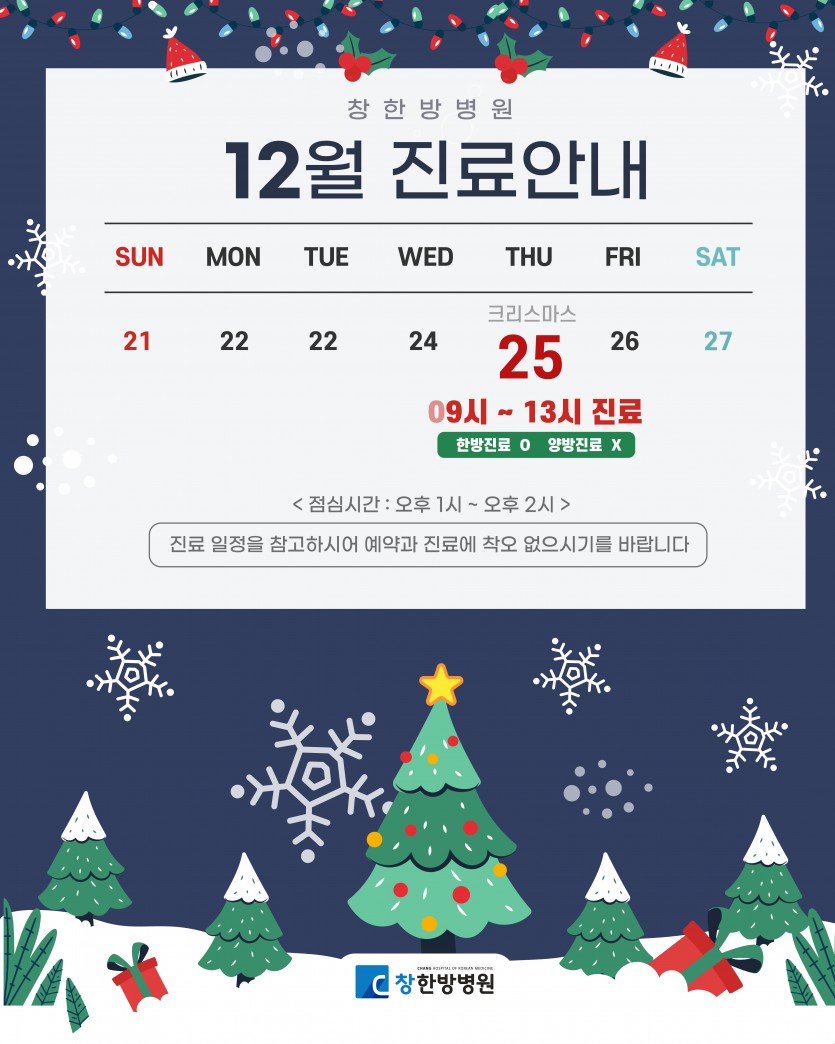 2025년 12월 진료안내 페이지 정보 작성자 창한방병원 조회 229회 작성일 25-11-28 14:38 목록 본문 내용 참고하시어 내원에 불편함이 없으시기 바랍니다 감사합니다 이전글창한방병원에서는 마취통증의학과 전문의의 양방치료를 만나보실 수 있습니다 25.12.18 다음글2025년 12월 암환우 복지프로그램 25.11.28