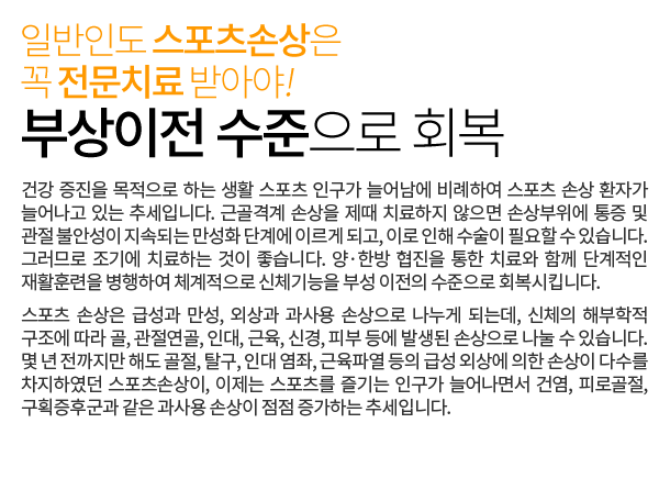 스포츠손상클리닉 단계별 치료진행 환자분들의 상태를 면밀히 확인, 후유증이 없도록 끝까지 치료합니다 Step 1. 방문 및 접수 예약된 시간에 내원하시면, 초진접수증 작성을 통해 접수를 진행합니다. 손상날짜 및 증상을 알려주시면 원활한 진료가 가능합니다. Step 2. 예진 상담 원무과 및 상담 선생님의 지도 하에 환자분의 불편 증상 예진을 도와드립니다. Step 3. 진료 클리닉 전문 원장님의 진료를 통해 환자분의 불편 증상의 원인을 진단하고 치료 계획을 수립해드립니다. 입원치료가 필요할 경우 입원안내를 원무과 및 해당 간호사실에서 해드립니다. Step 4. 사고부위 치료 환자분께 필요한 맞춤형 치료를 시행해드립니다. 일반적인 침치료, 부항치료, 약침치료, 뜸치료를 해드리며 예상 소요시간은 약 30-40분입니다. 환자분의 상태에 따라 세밀한 치료 계획은 달라질 수 있습니다. Step 5. 복약지도 및 치료기간 설명 클리닉 전문 원장님께서 처방된 한약을 복용하시는 동안 반드시 지켜야 하는 사항에 대해 안내를 해드립니다. 또한 효과적인 치료를 위한 생활습관을 어떻게 유지하셔야 하는 지 설명해드립니다.