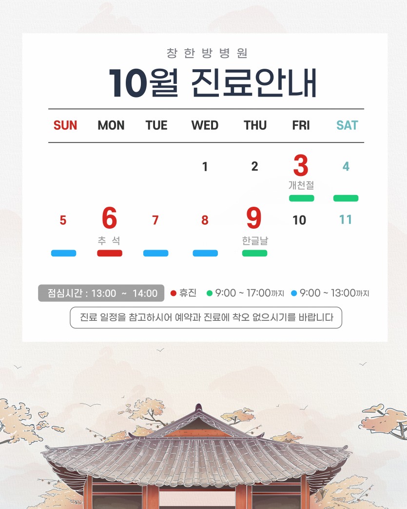 2025년 10월 진료안내 페이지 정보 작성자 창한방병원 조회 153회 작성일 25-09-29 09:47 목록 본문 내용참고하시어 불편함이 없으시기 바랍니다 언제나 행복한 하루보내세요 감사합니다 이전글2025년 10월 암환우 복지프로그램 25.09.30 다음글2025년 추석! 사랑하는 분들에게 내 마음을 표현해보세요 25.09.15