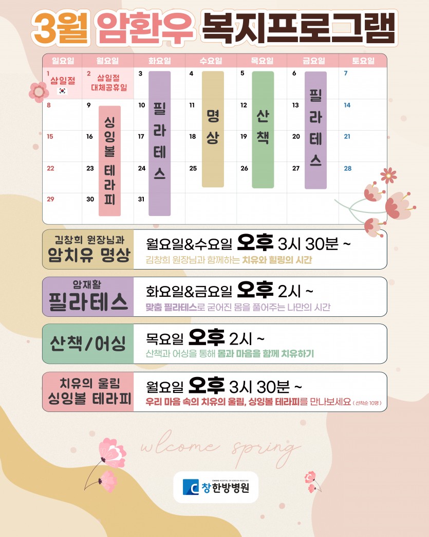 2026년 3월 암환우 복지프로그램 페이지 정보 작성자 창한방병원 조회 4회 작성일 26-02-27 10:17 목록 본문 내용참고하시어 내원하시는데 불편함이 없으시기 바랍니다 감사합니다 다음글2026년 3월 진료안내 26.02.26