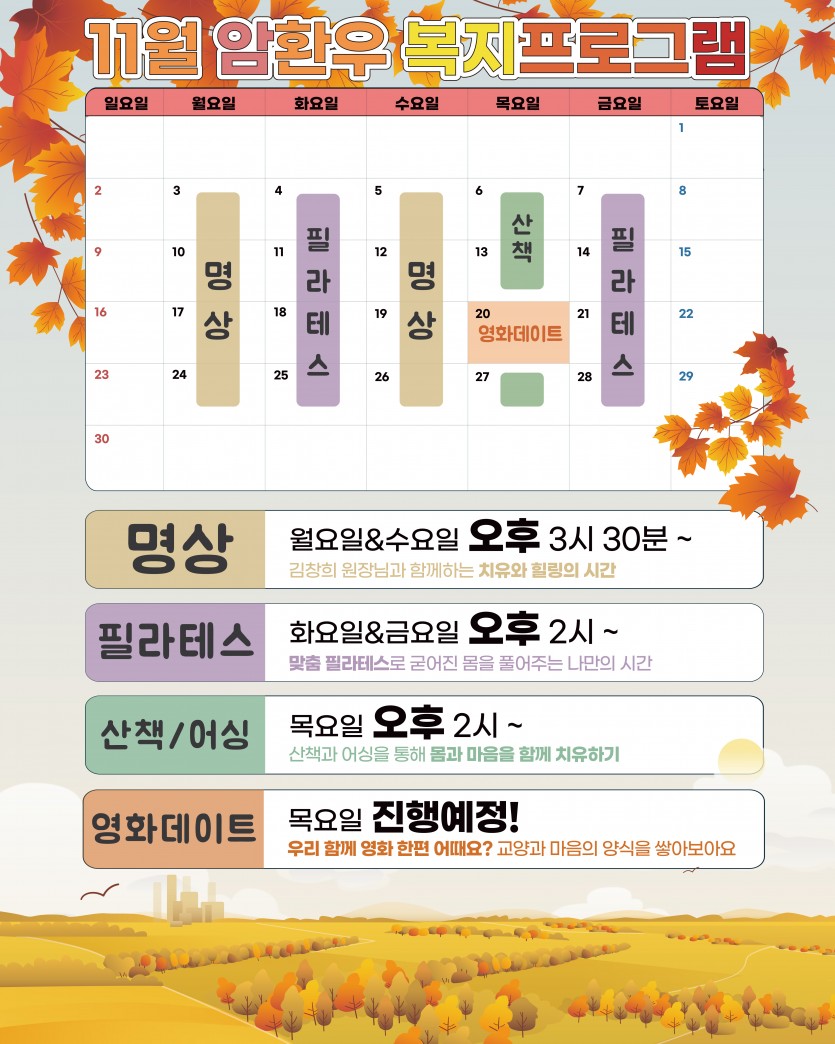 2025년 11월 암환우 복지프로그램 안내 페이지 정보 작성자 창한방병원 조회 230회 작성일 25-10-31 10:34 목록 본문 내용 참고하시어 내원에 불편함이 없으시기 바랍니다 감사합니다 이전글수험자 및 수험자 가족 특별 이벤트 25.11.11 다음글2025년 10월 암환우 복지프로그램 25.09.30