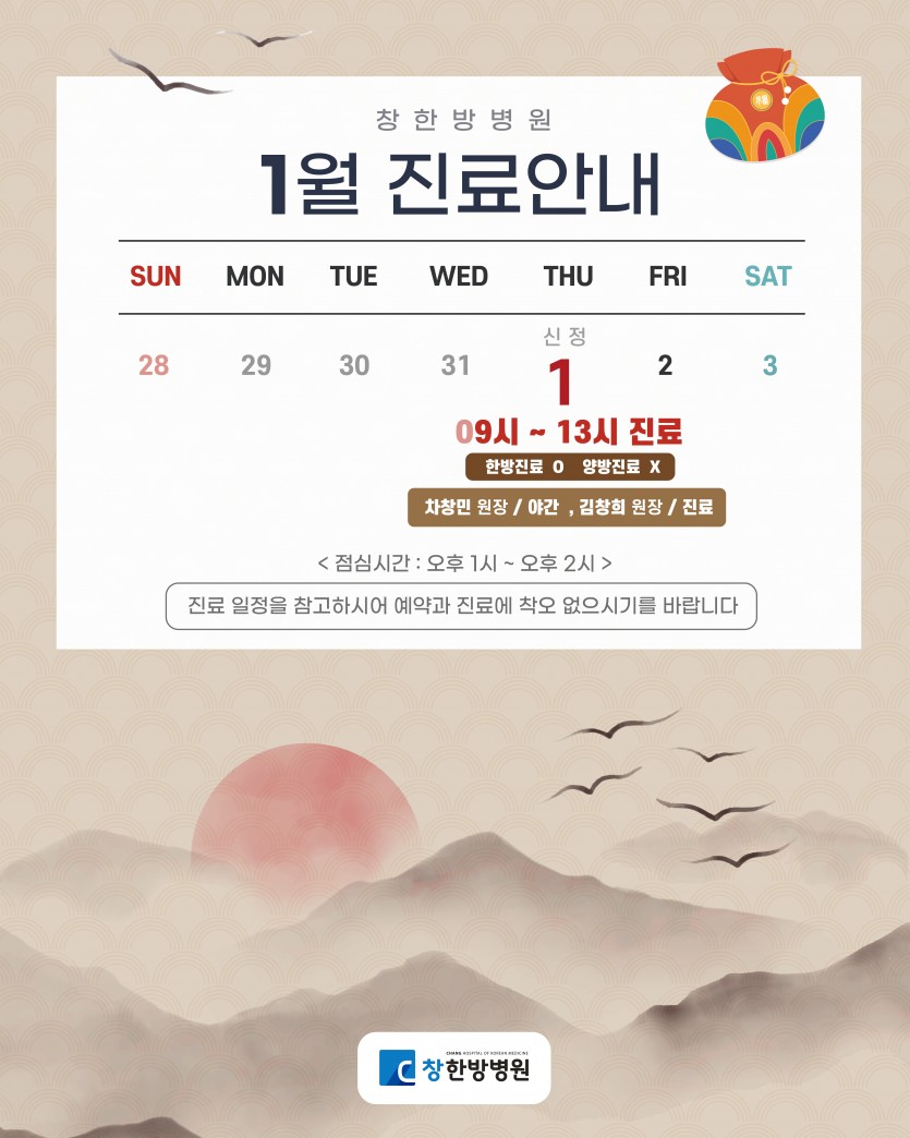 2026년 1월 진료안내 페이지 정보 작성자 창한방병원 조회 258회 작성일 25-12-29 09:33 목록 본문 내용 참고하시어 내원에 불편함이 없으시기 바랍니다 창한방병원 환우분들 새해 복 많이받으시고 건강하세요 감사합니다 이전글2026년 1월 암환우 복지프로그램 안내 25.12.31 다음글창한방병원에서는 마취통증의학과 전문의의 양방치료를 만나보실 수 있습니다 25.12.18